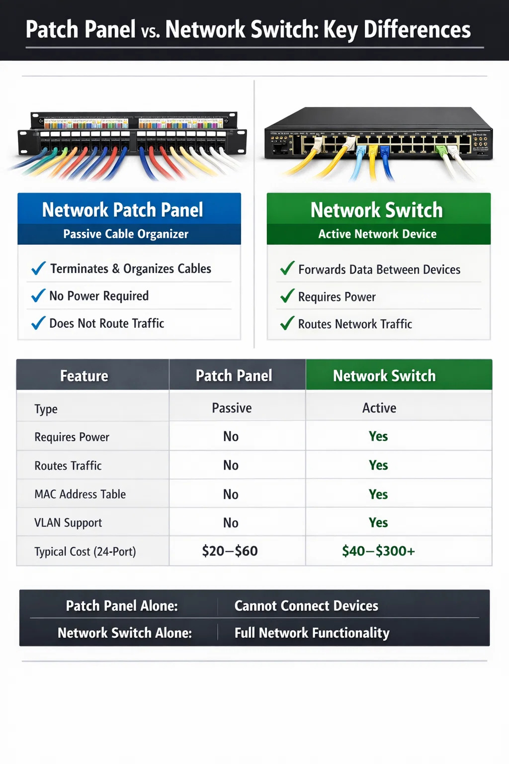 Un panneau de brassage et un commutateur réseau ne sont pas interchangeables : ils servent à des fins complètement différentes et vous avez besoin des deux pour un réseau câblé fonctionnel. Un panneau de brassage réseau est un appareil passif : il organise et termine les chemins de câbles autour de votre maison ou de votre bâtiment vers un emplacement central. Il n'achemine pas le trafic, n'attribue pas d'adresses IP et ne fournit aucune fonctionnalité réseau active. Un commutateur, en revanche, est un appareil actif qui déplace réellement les données entre les appareils connectés.