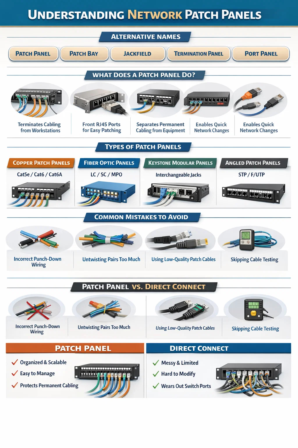 A patch panel goes by several names depending on the industry, the installer, and the era of installation. The most widely used alternative names include patch bay, jackfield, and termination panel. In audio and broadcast environments, "patch bay" is the dominant term. In structured cabling and IT environments, "patch panel" is standard, but you will also encounter "port panel," "termination block," and occasionally "distribution frame" depending on the application.