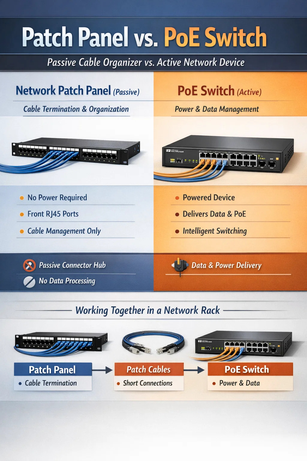 Dans une installation professionnelle, ces deux-là ne sont pas concurrents mais partenaires. Le panneau de brassage fournit un point d'atterrissage statique pour tous les fils du bâtiment, et le commutateur PoE fournit la connectivité et l'alimentation nécessaires pour rendre ces fils fonctionnels pour des appareils tels que des caméras IP, des téléphones VoIP et des points d'accès sans fil.