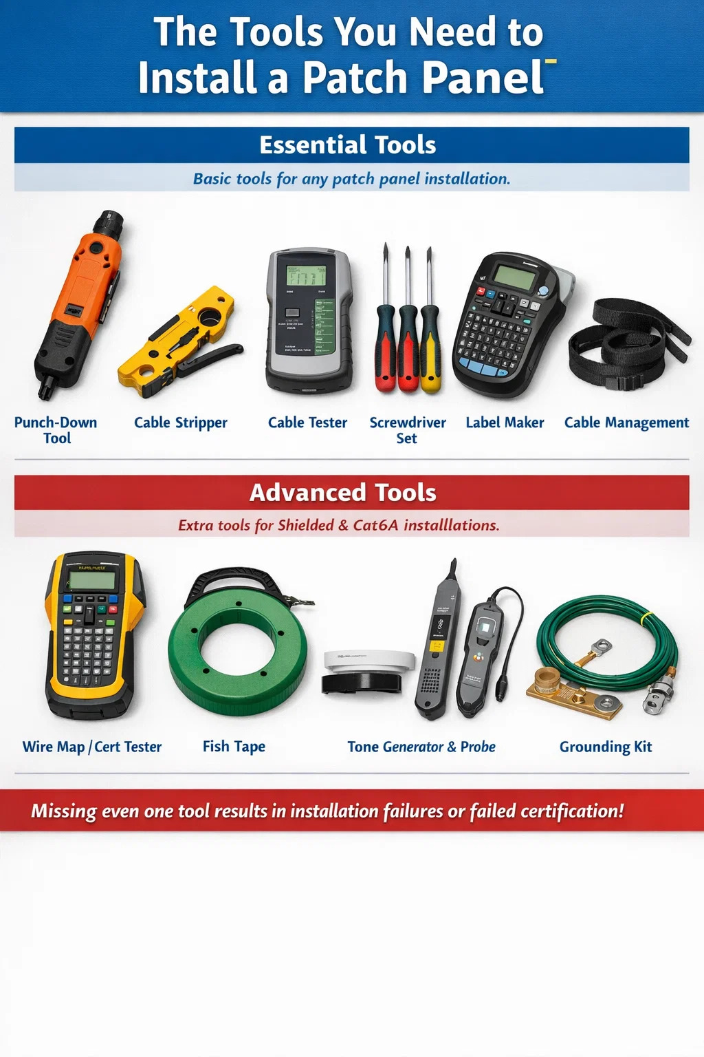 Pour installer un panneau de brassage réseau , vous avez besoin d'un outil de poinçonnage, d'un dénudeur de câble, d'un testeur de câble, d'un jeu de tournevis, d'une étiqueteuse et d'une solution de gestion des câbles telle que des sangles velcro ou des attaches de câble. Pour les installations plus exigeantes, en particulier les câbles Cat6A ou blindés, vous aurez également besoin d'un testeur de plan de câblage ou d'un testeur de certification complet, d'un ruban adhésif ou d'une poignée de tirage de câble et d'un générateur de tonalité avec sonde. Ce ne sont pas des extras facultatifs. Manquer ne serait-ce que l'un d'entre eux entraîne soit une installation défaillante, un canal non certifié ou un problème de maintenance qui fait surface des mois plus tard.